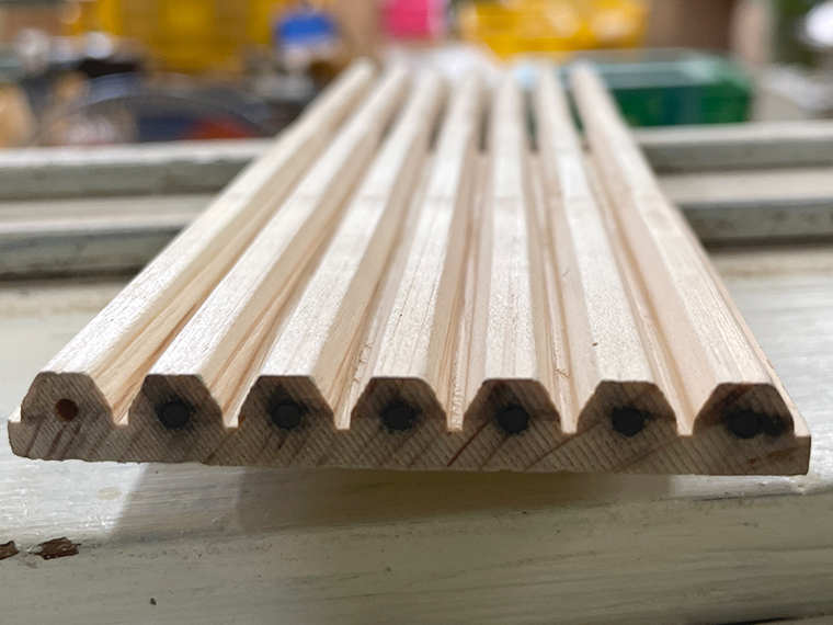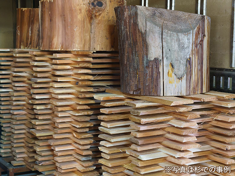 不良品(ふりょうひん)や端材(はざい)を薪(まき)ボイラーで燃(も)やし、その熱(ねつ)で板をかわかします。
