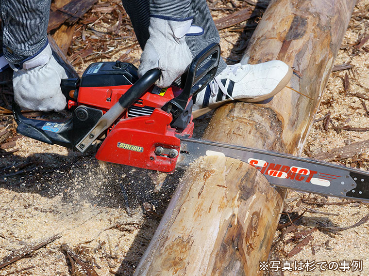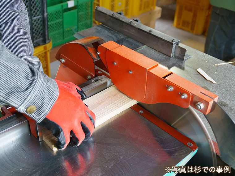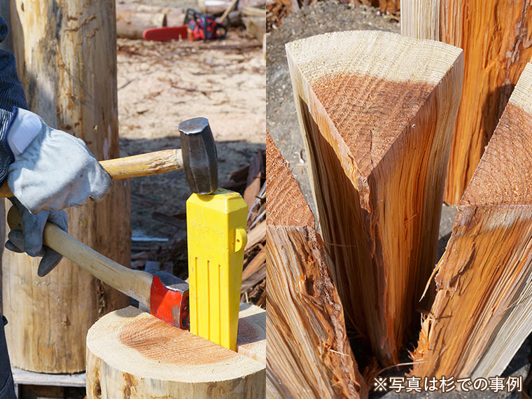 みかんの房(ふさ)のかたち(ショートケーキのようなかたち)に間伐材丸太を割(わ)っていきます。