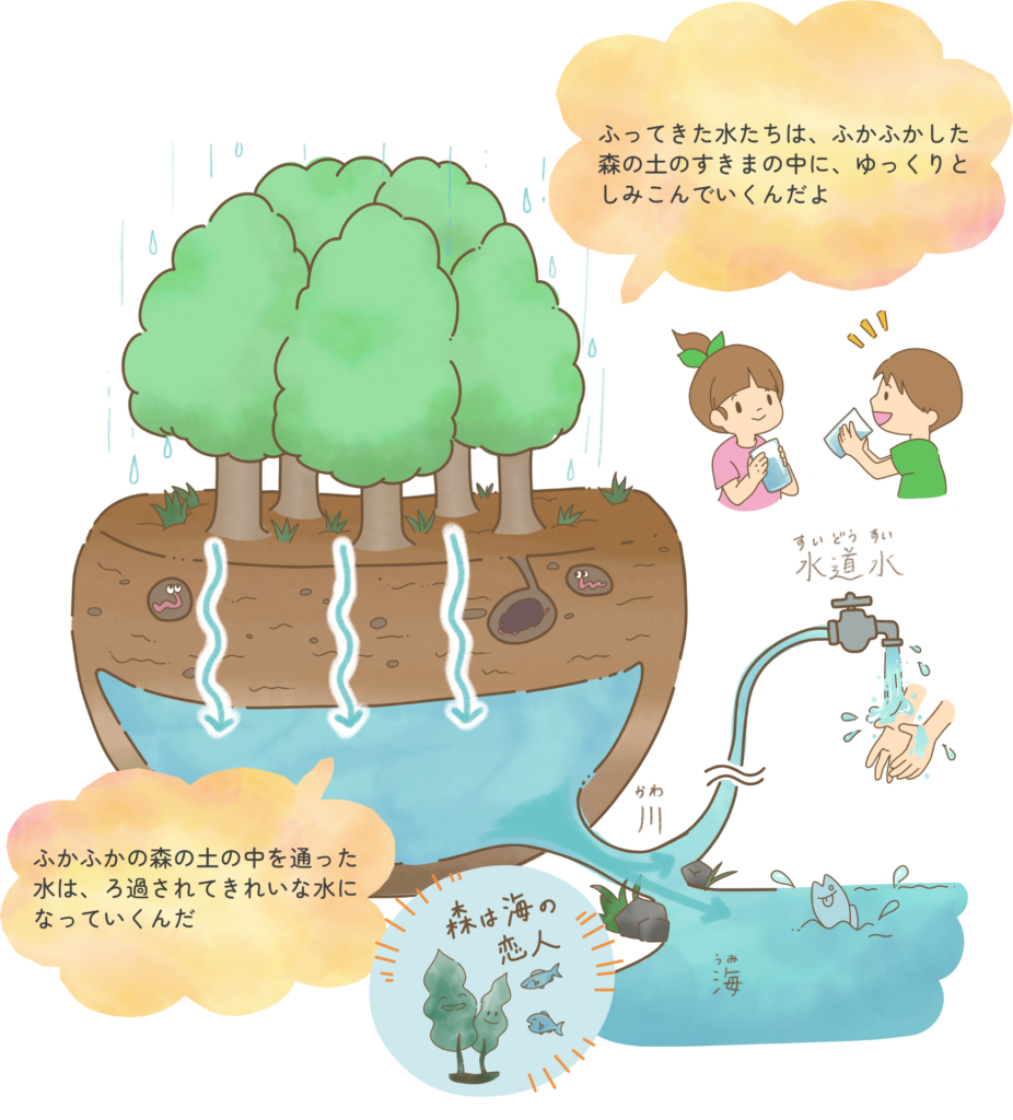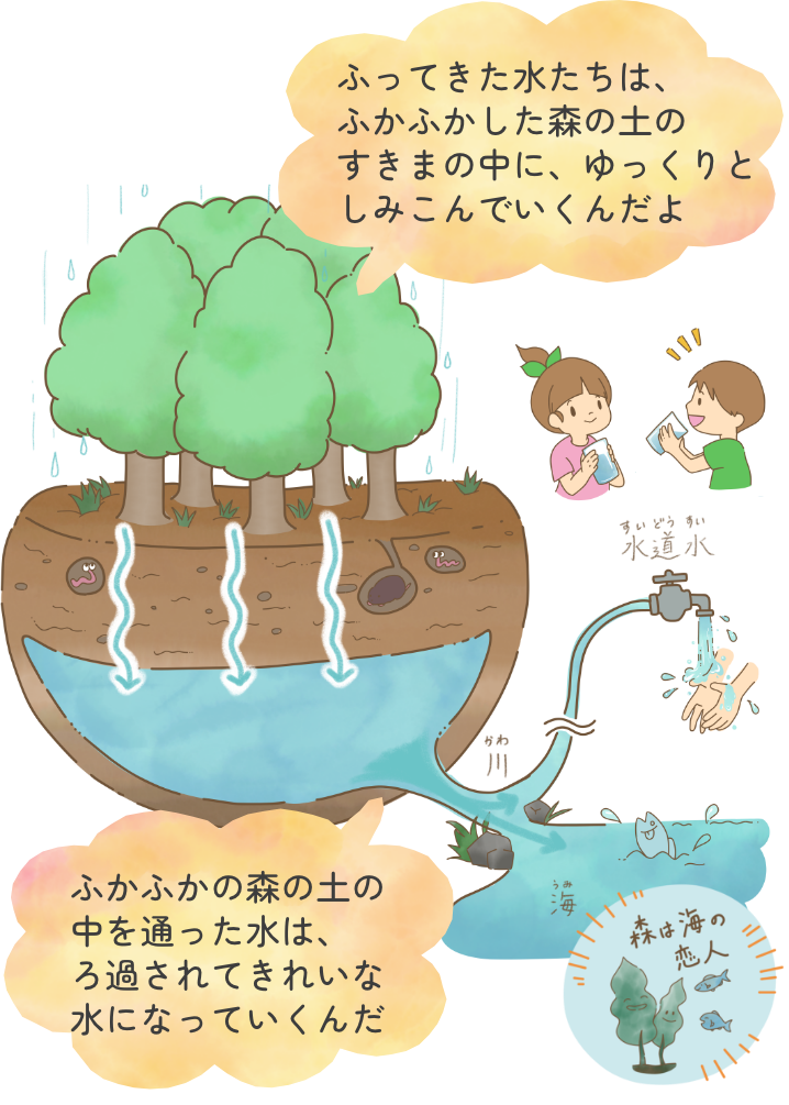 森林にふった雨や雪は、すぐに森林から流れ出ることはなく、地中(ちちゅう)にしみこみ、地下水となりゆっくり流れでます。