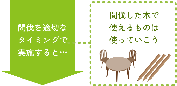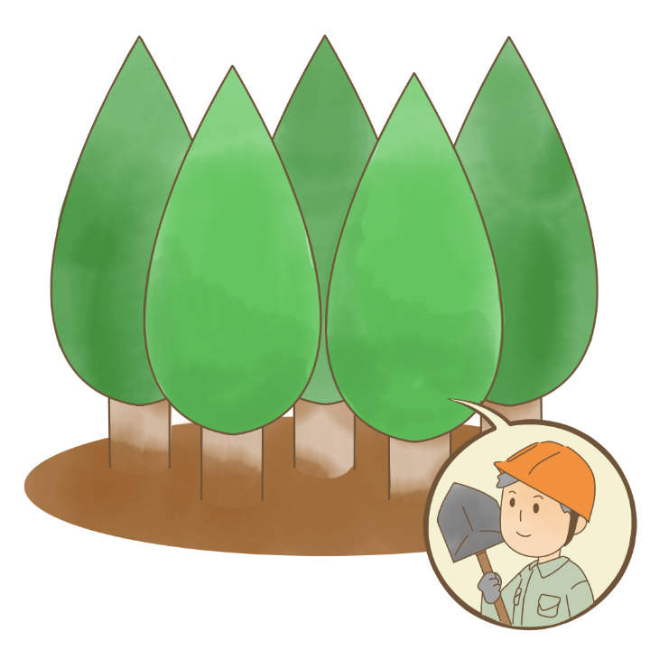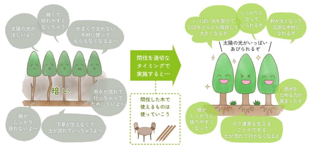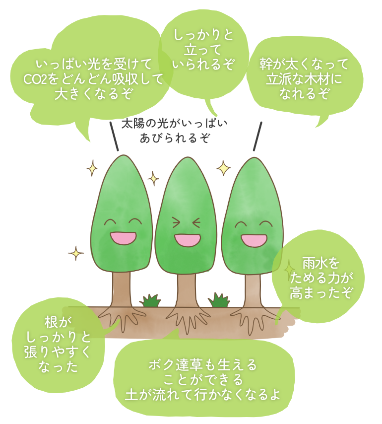 森林を元気に大きくそだてるために、木をきって、木のこみぐあいをちょうせいする作業のことです。