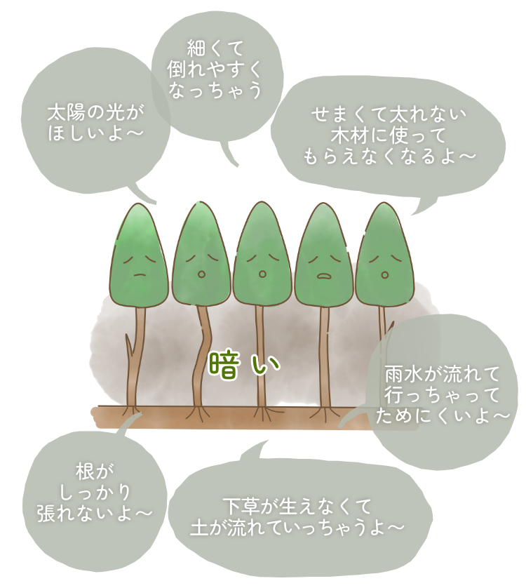 人工林は木をうえたあとに間伐をおこなわないでいると、木どうしがこみあってしまい、太陽の光があたらなくなります。