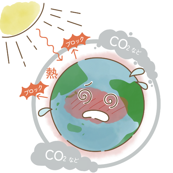 地下にある石油などの化石資源(かせきしげん)を使いつづけていると、大気中のCO₂など※の割合(わりあい)がどんどん増えて、地球が温室みたいに熱をため込んで、だんだん暖かくなっていっちゃうんだよ。世界では、このCO₂などの割合を少しでも減(へ)らしていこうとしているんだ。